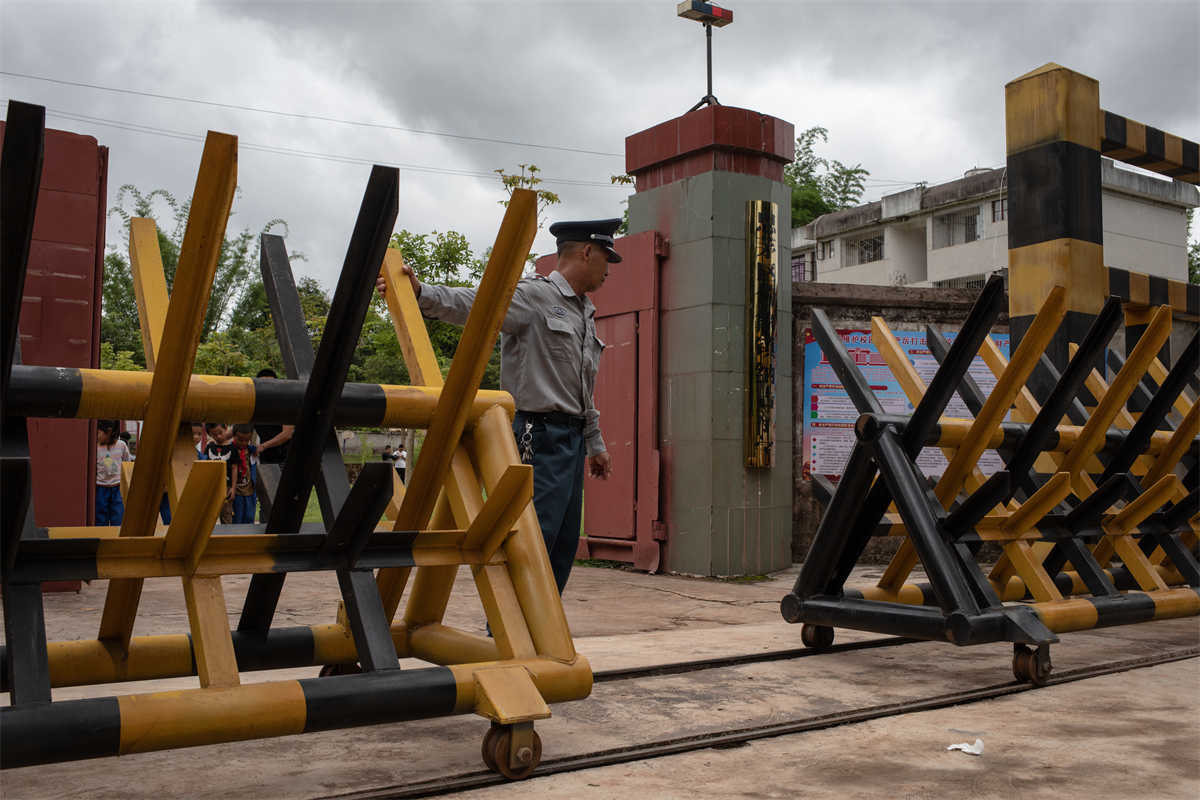 普洱市思茅区倚象镇纳吉小学,保安正关闭铁栅栏。