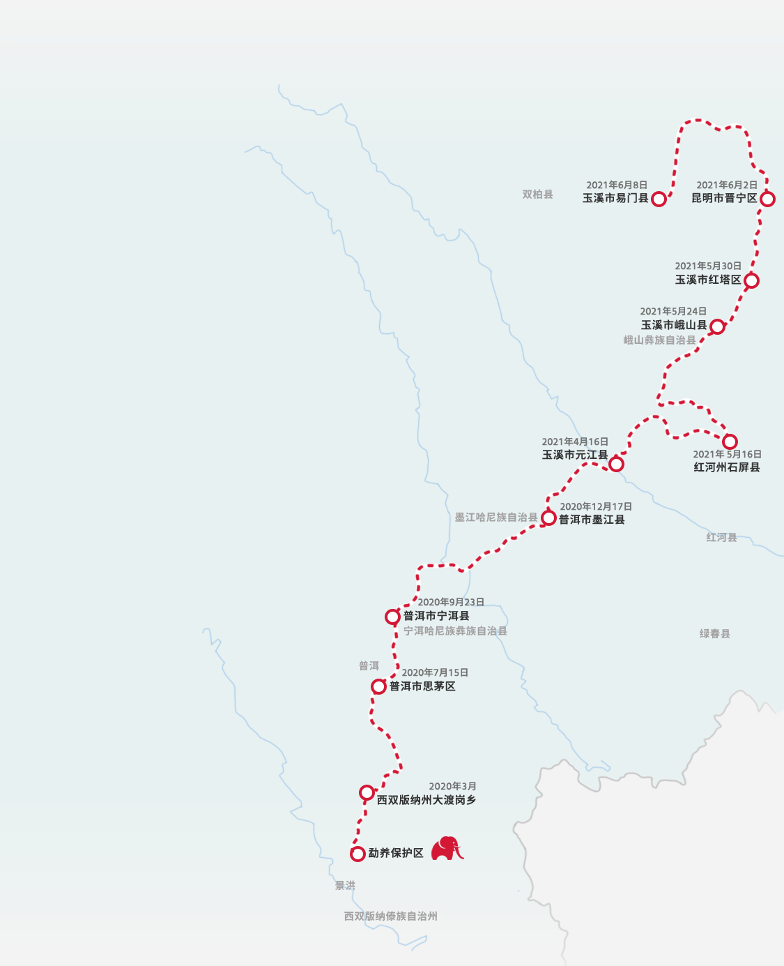 从云南省西双版纳傣族自治州出发,十几头亚洲象跨过不同的气候带,迂回行进数千公里,途经玉溪、红河、昆明3个州(市)8个县(市、区),向北移动超过半个云南的距离。