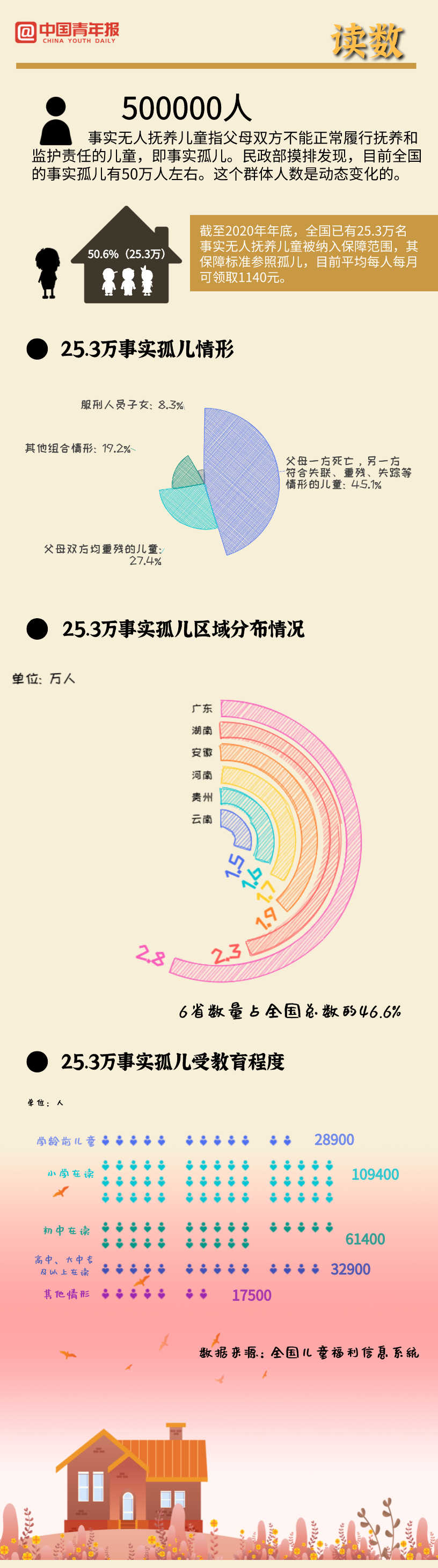 事实孤儿,指父母没有双亡但家庭没有能力或没有意愿抚养的儿童。2019年,民政部摸底排查数据显示,全国事实孤儿约有50万名。2020年1月1日,民政部等中央12部门联合印发的《关于进一步加强事实无人抚养儿童保障工作的意见》开始实施。
