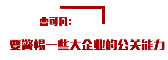 全国人大代表、上海新娱乐传媒有限公司首席主持人曹可凡说,要警惕一些大企业的公关能力,福喜公司事发后,曾找到他和另一位全国人大代表,希望能帮忙“忽悠一下”,曹可凡随后向多方了解情况,发现实际情况和福喜方面的说法完全不一样。据他了解,福喜方面动用了许多力量,“反扑能力非常强大”,甚至在APEC会议期间,还通过美方向中方施加压力。