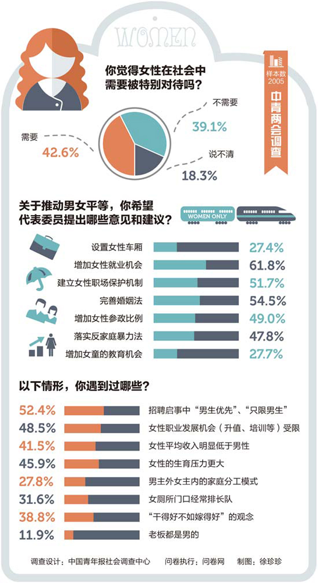 调查显示,51.6%的受访者认为自己遭遇了性别歧视。38.8%的受访者在生活中遇到过“干得好不如嫁得好”的观念。