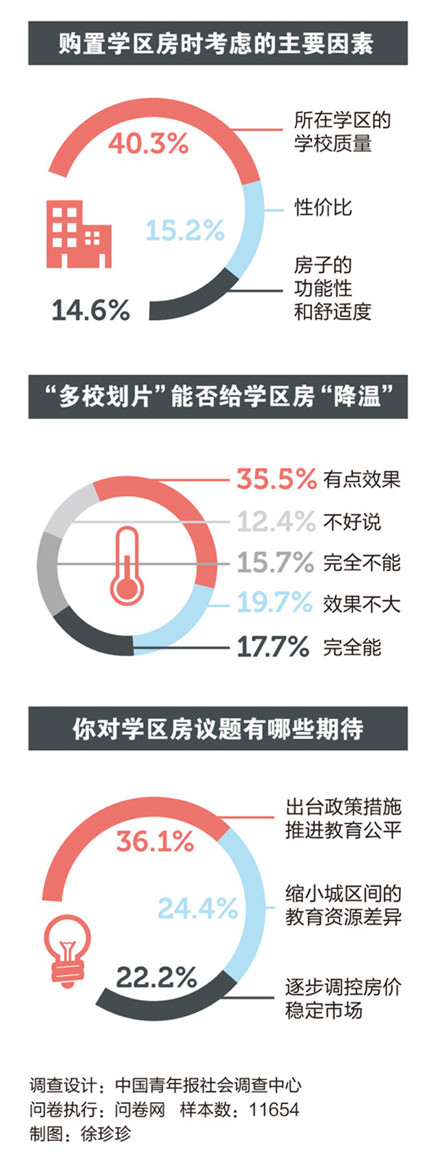 调查显示,16.3%的受访者已经买了学区房,22.3%的受访者正打算购买学区房,其中12.3%的受访者打算近期购买。调查中,40.3%的受访者购置学区房时主要考虑因素是所在地的学区质量。57.2%的受访者购买学区房时首选名校附近。